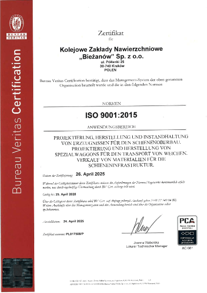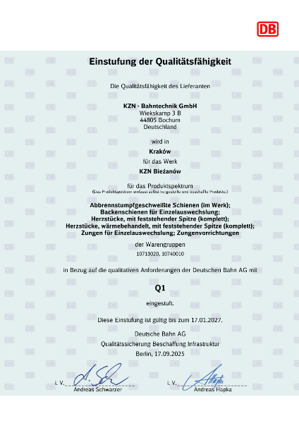 Operating in the industry, where quality, technical reliability and repeatability translates directly the level of security of people and goods, use certification systems to confirm the high standards of our products. Certificates enable us to provide products to the markets of railway, trams and steel bridge construction.